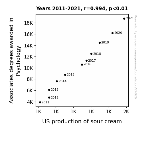 This means 98.7% of the change in the one variable (i.e., US production of sour cream) is predictable based on the change in the other (i.e., Associates degrees awarded in Psychology) over the 11 years from 2011 through 2021.