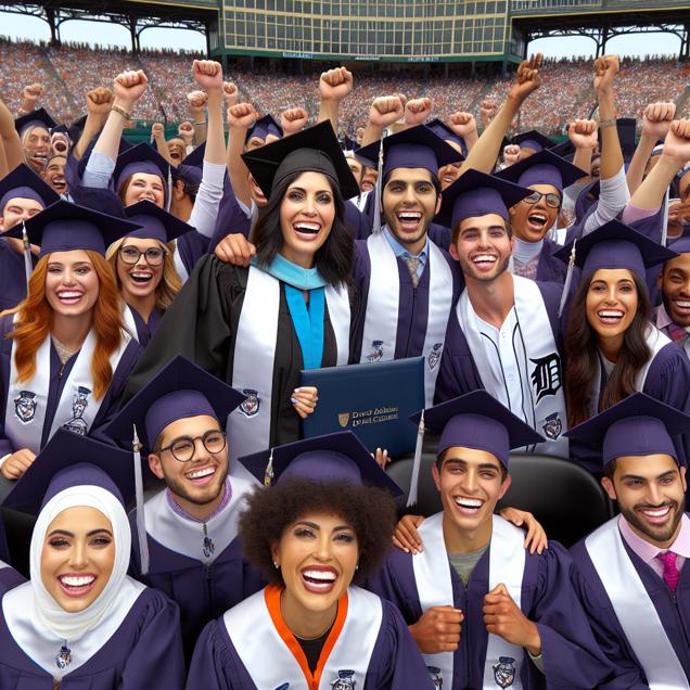 ChatGPT: In a bustling college ceremony, proud students in graduation caps proudly hold up their Associate degrees in Dental Assisting, beaming with happy, confident smiles. In the distance, the Detroit Tigers celebrate a series of wins, their players flashing bright, radiant smiles as they clutch their baseball caps in triumph. A team dentist stands among them, grinning with pride at the team's exceptional performance.