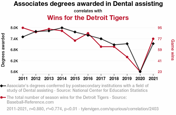 This means 77.4% of the change in the one variable (i.e., Wins for the Detroit Tigers) is predictable based on the change in the other (i.e., Associates degrees awarded in Dental assisting) over the 11 years from 2011 through 2021.
