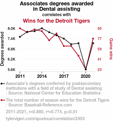 User prompt: Please provide potential search keywords for a paper titled Molar Modest Dental Degrees and Detroit Tigers' Decisive Deeds with an abstract of This paper examines the peculiar relationship between the number of Associate degrees awarded in Dental Assisting and the on-the-field performance of the Detroit Tigers in Major League Baseball. Utilizing data from the National Center for Education Statistics and Baseball-Reference.com, our team delved into this unconventional correlation, uncovering a surprising coefficient of 0.8798996, with statistical significance at p < 0.01, for the period spanning from 2011 to 2021. Our findings not only shed light on the intertwined fate of Tiger wins and dental degrees but also prompt further investigation into the mysterious forces at play in the world of sports and education. Additionally, it provides a new angle on the age-old question: do dental degrees hold the key to climbing the league standings, or is it just a case of coincidental cuspid occurrences?