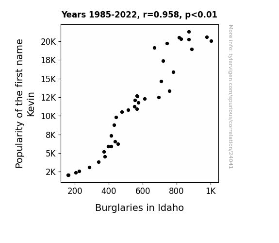 This means 91.9% of the change in the one variable (i.e., Burglaries in Idaho) is predictable based on the change in the other (i.e., Popularity of the first name Kevin) over the 38 years from 1985 through 2022.