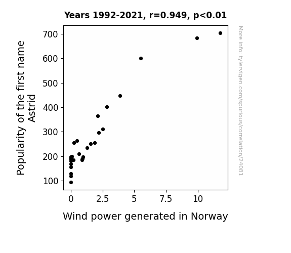 This means 90% of the change in the one variable (i.e., Wind power generated in Norway) is predictable based on the change in the other (i.e., Popularity of the first name Astrid) over the 30 years from 1992 through 2021.