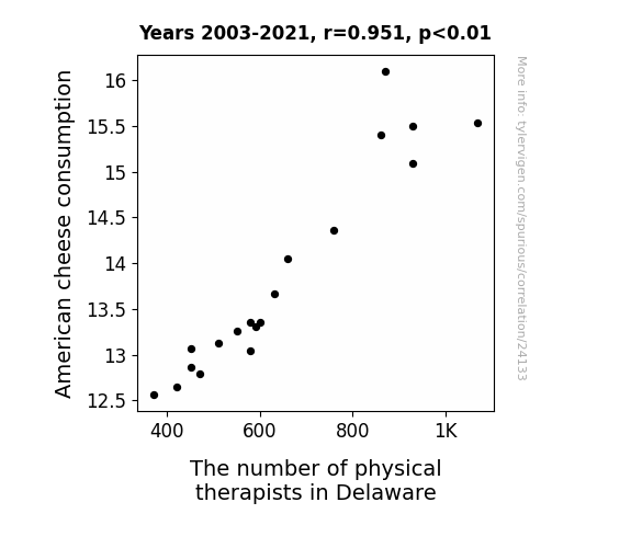 This means 90.4% of the change in the one variable (i.e., The number of physical therapists in Delaware) is predictable based on the change in the other (i.e., American cheese consumption) over the 19 years from 2003 through 2021.