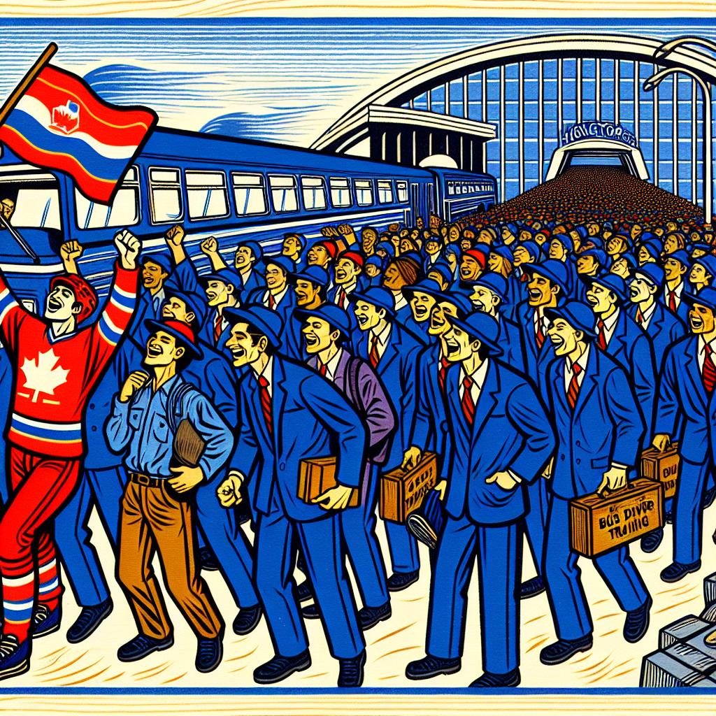 ChatGPT: In Detroit, a row of smiling Red Wings fans are seen celebrating on the sidewalk outside the hockey arena, proudly holding up a "W" flag to mark their team's latest victory. In the background, a line of new recruits, wearing blue uniforms, are eagerly lining up for bus driver training, inspired to join the transportation workforce. The energy and spirit of the hockey win seems to be propelling the city's residents toward new opportunities, creating an atmosphere of excitement and motivation.