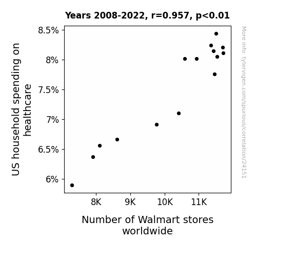 This means 91.6% of the change in the one variable (i.e., Number of Walmart stores worldwide) is predictable based on the change in the other (i.e., US household spending on healthcare) over the 15 years from 2008 through 2022.