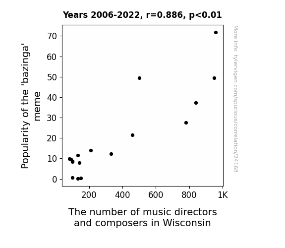 This means 78.6% of the change in the one variable (i.e., The number of music directors and composers in Wisconsin) is predictable based on the change in the other (i.e., Popularity of the 'bazinga' meme) over the 17 years from 2006 through 2022.