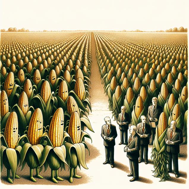User prompt: Please respond with an image generation prompt that would be likely to create an interesting visual using DALLE-3, using the following style: [ Whimsical illustration ] and depicting this scene: In a vast cornfield in Minnesota, rows of tall, genetically modified corn stretch out as far as the eye can see. Among the stalks, a group of corn plants is engaged in a heated debate with their neighboring crops, while a line of sharp-suited lawyers made of corn husks and silk ties gather around, ready to represent the feuding plants. The growing demand for "corn-lawyers" has led to an increasing number of lawyers across the United States, portrayed by fields of cornstalk figures in business suits, each specializing in legal matters concerning the genetically modified crops. Keep the visual depiction simple. Do not include any words or speech bubbles.