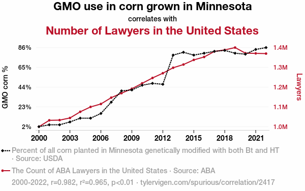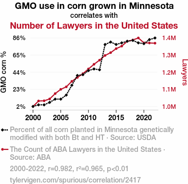 This means 96.5% of the change in the one variable (i.e., Number of Lawyers in the United States) is predictable based on the change in the other (i.e., GMO use in corn grown in Minnesota) over the 23 years from 2000 through 2022.