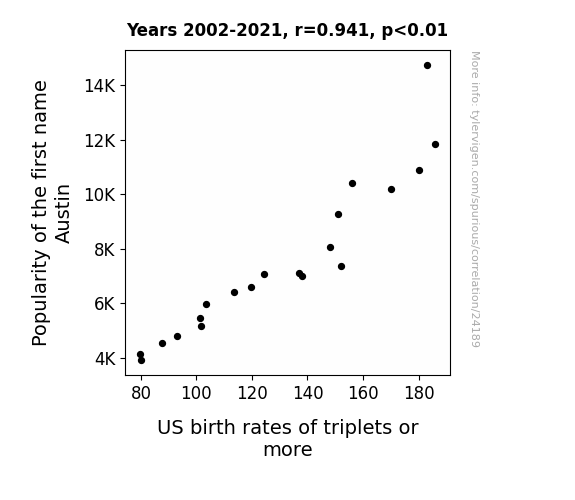 This means 88.5% of the change in the one variable (i.e., US birth rates of triplets or more) is predictable based on the change in the other (i.e., Popularity of the first name Austin) over the 20 years from 2002 through 2021.