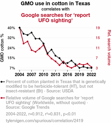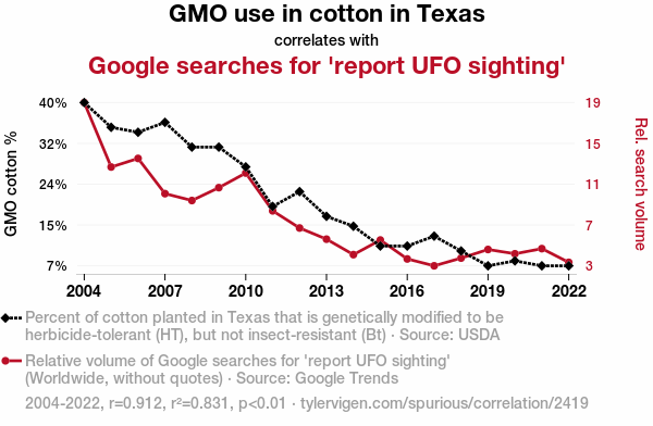 - The spurious research paper: Genetically Modified Cotton in Texas: A Link to Google Searches for 'Report UFO Sighting'?