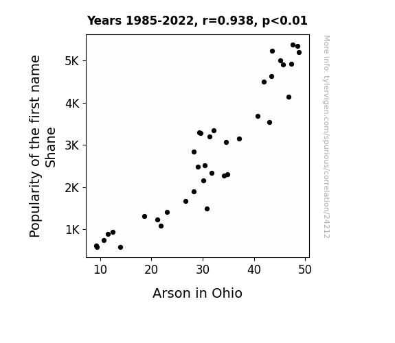 This means 88.1% of the change in the one variable (i.e., Arson in Ohio) is predictable based on the change in the other (i.e., Popularity of the first name Shane) over the 38 years from 1985 through 2022.