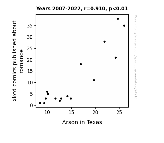This means 82.8% of the change in the one variable (i.e., Arson in Texas) is predictable based on the change in the other (i.e., xkcd comics published about romance) over the 16 years from 2007 through 2022.