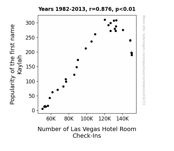 This means 76.7% of the change in the one variable (i.e., Number of Las Vegas Hotel Room Check-Ins) is predictable based on the change in the other (i.e., Popularity of the first name Kaylah) over the 32 years from 1982 through 2013.