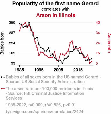 This means 82.6% of the change in the one variable (i.e., Arson in Illinois) is predictable based on the change in the other (i.e., Popularity of the first name Gerard) over the 38 years from 1985 through 2022.
