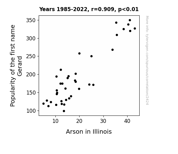 After crunching the numbers, we uncovered a striking correlation coefficient of 0.9089884 and a p-value of less than 0.01 from 1985 to 2022. This statistical sizzle suggests a strong positive association between the popularity of the name Gerard and the incidence of arson in the Land of Lincoln. Our findings spark the humorous hypothesis that perhaps there's something about the name Gerard that sets hearts and fires ablaze.