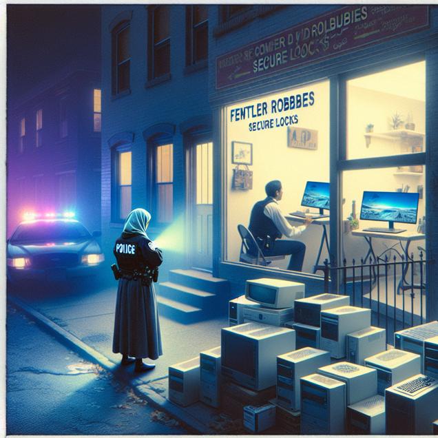 ChatGPT: In a quiet street in the District of Columbia, a police officer stands outside a house, shining a flashlight around the area. Nearby, a computer store's window displays a sign reading "Fewer Robberies, Secure Locks". Inside the store, a stack of desktop computers sits untouched. Meanwhile, a computer user at home gazes at their unchanging desktop background, with fewer Google searches for "desktop background" on their screen.