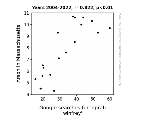 This means 67.6% of the change in the one variable (i.e., Google searches for 'oprah winfrey') is predictable based on the change in the other (i.e., Arson in Massachusetts) over the 19 years from 2004 through 2022.