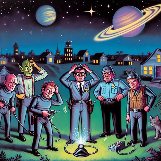 User prompt: Please respond with an image generation prompt that would be likely to create an interesting visual using DALLE-3, using the following style: [ a funny image you would see on reddit ] and depicting this scene: In a quiet Kansas town, a group of frustrated intergalactic thieves stood around their malfunctioning teleportation devices, scratching their heads in bewilderment. Meanwhile, millions of miles away, Neptune hung in the night sky, its celestial presence creating a ripple effect that disrupted the thieves' carefully planned heists. As a result, the local authorities reported a noticeable decrease in burglaries across Kansas, leaving the town at peace as Neptune continued to exert its mysterious influence from afar. Keep the visual depiction simple. Do not include any words or speech bubbles.