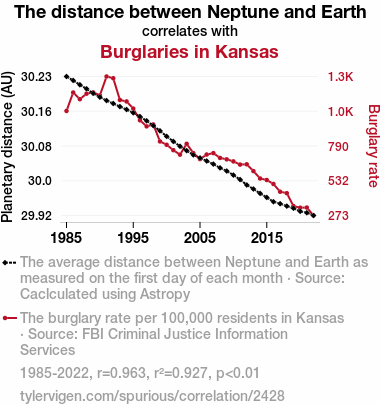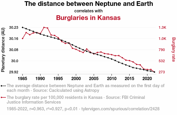 A linear line chart with years as the X-axis and two variables on the Y-axis. The first variable is The distance between Neptune and Earth and the second variable is Burglaries in Kansas.  The chart goes from 1985 to 2022, and the two variables track closely in value over that time. Small Image
