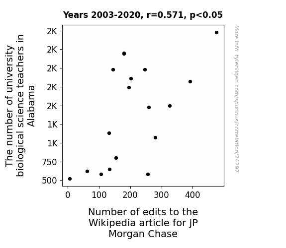 This means 32.6% of the change in the one variable (i.e., Number of edits to the Wikipedia article for JP Morgan Chase) is predictable based on the change in the other (i.e., The number of university biological science teachers in Alabama) over the 18 years from 2003 through 2020.