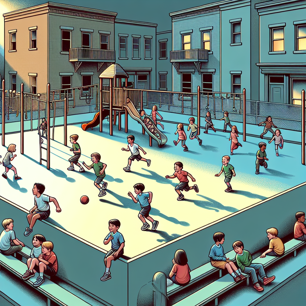 ChatGPT: Generate an image of a minimalist, brutalist playground set in a bustling Connecticut town. The playground is teeming with energetic children, with a specific focus on a group of kids engaged in an intense game of tag. One particular boy, named Kevin, stands out as the leader of this mischievous group, known as the "Klepto-Kevs." Over time, the number of Kevins in the neighborhood decreases, resulting in a noticeable decline in the "Klepto-Kevs" and, subsequently, a significant decrease in robberies around town. The once bustling playground now exudes a sense of safety and tranquility.