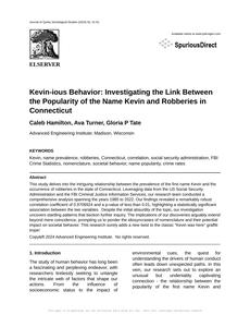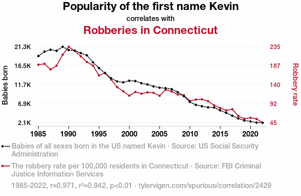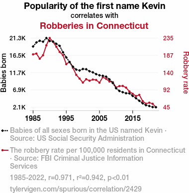User prompt: Please provide potential search keywords for a paper titled Kevin-ious Behavior: Investigating the Link Between the Popularity of the Name Kevin and Robberies in Connecticut with an abstract of This study delves into the intriguing relationship between the prevalence of the first name Kevin and the occurrence of robberies in the state of Connecticut. Leveraging data from the US Social Security Administration and the FBI Criminal Justice Information Services, our research team conducted a comprehensive analysis spanning the years 1985 to 2022. Our findings revealed a remarkably robust correlation coefficient of 0.9706924 and a p-value of less than 0.01, highlighting a statistically significant association between the two variables.