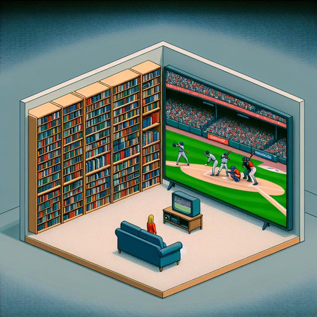ChatGPT: [ Annual book sales in the US: Scalar art ] Generate an image depicting a scene in a bookstore with noticeably emptier shelves, portraying the declining book sales. Add a TV screen nearby showing the Houston Astros struggling on the field, losing consecutive games. The connection between the dwindling book sales and the declining wins for the Astros should be evident, as if the two are interconnected. The lack of literature should seem to leave fans more focused on the game, and the Astros should struggle to perform without the usual support of their devoted audience. Ensure the visual depiction is simple, without including any words or speech bubbles.