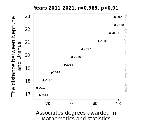 This means 97% of the change in the one variable (i.e., Associates degrees awarded in Mathematics and statistics) is predictable based on the change in the other (i.e., The distance between Neptune and Uranus) over the 11 years from 2011 through 2021.