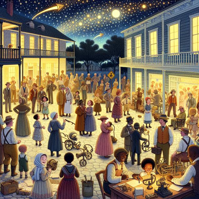 Prompt: [ Whimsical illustration ] In a Louisiana town, the night sky is dotted with twinkling stars and a bright, mysterious light hovers above. People of all ages gather outside, gazing up with wide-eyed wonder and animated expressions. The townsfolk are shown in a variety of outfits, from overalls to dresses to military uniforms, reflecting the diverse nature of the community. Children point excitedly while adults converse animatedly, their body language expressing curiosity and amazement. Some individuals are depicted holding quirky homemade contraptions, representing the inventive ideas sparked by the celestial phenomenon. In the backdrop, a quaint town square with cobbled streets and charming southern architecture sets the stage for the scene. The dimly lit buildings exude a warm, inviting glow, with flickering lamplight emanating from the windows. A sense of togetherness and shared intrigue permeates the illustration, as the townspeople bond over their collective fascination with the mysterious light. In a separate scene adjacent to the town square, a bustling office of patent officers is shown diligently processing a higher number of applications. The whimsical touch is captured in the form of quirky machinery and fantastical inventions displayed on desks and hanging from the ceiling. Louisianans are depicted filing patents for their new technological creations inspired by the UFO sightings, showcasing the tangible impact of the celestial event on their creative endeavors. Overall, the illustration presents a vibrant and enchanting visual narrative that encapsulates the transformative power of inspiration from the unknown, bringing to life the whimsy and inventive spirit fueled by the otherworldly phenomena. The depiction should include only scenes, people, and objects, it should not include text or speech bubbles.
