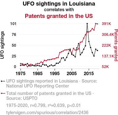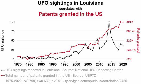Your research team used data from National UFO Reporting Center and USPTO to assess this nagging question. You found a correlation coefficient of 0.7993224 and p < 0.01 for 1975 to 2020.
