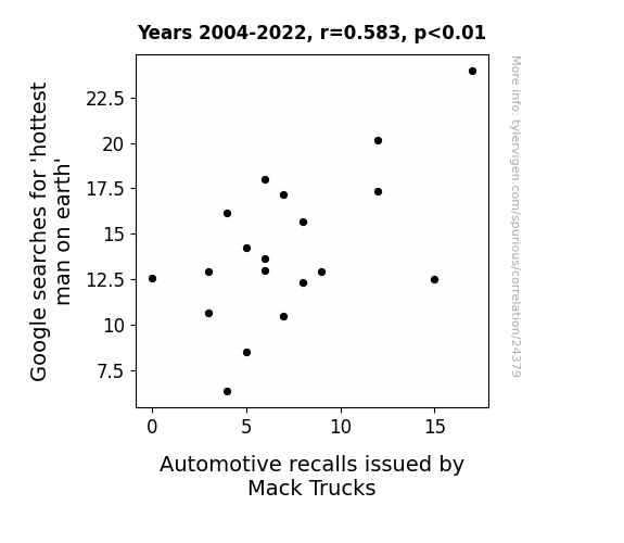 This means 34% of the change in the one variable (i.e., Automotive recalls issued by Mack Trucks) is predictable based on the change in the other (i.e., Google searches for 'hottest man on earth') over the 19 years from 2004 through 2022.