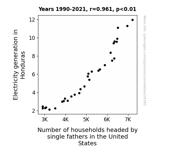 This means 92.4% of the change in the one variable (i.e., Number of households headed by single fathers in the United States) is predictable based on the change in the other (i.e., Electricity generation in Honduras) over the 32 years from 1990 through 2021.
