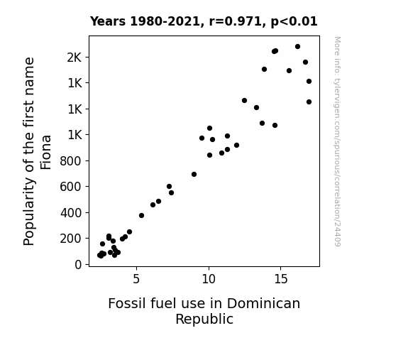 This means 94.2% of the change in the one variable (i.e., Fossil fuel use in Dominican Republic) is predictable based on the change in the other (i.e., Popularity of the first name Fiona) over the 42 years from 1980 through 2021.