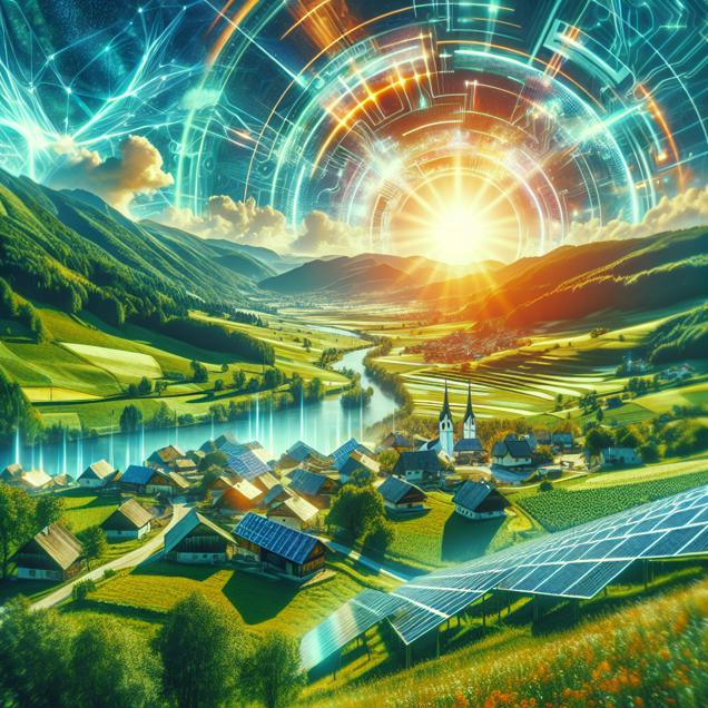 ChatGPT: Generate an image of a serene Slovenian countryside, with vibrant green hills and quaint villages bathed in bright sunlight. Show sleek solar panels dotting the landscape, soaking up the plentiful sunlight and emitting a futuristic, cyber-inspired glow. The image should convey a sense of technological harmony with nature, while also subtly hinting at a gentle chill settling over the landscape. The cyber art style should emphasize the connection between advanced energy technology and the natural world, with a touch of futuristic coolness.