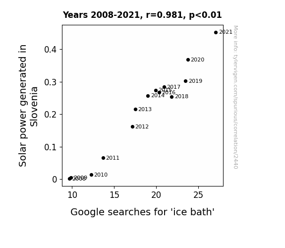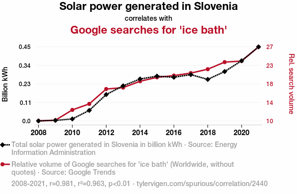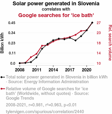 - The spurious research paper: Illuminating Insights: A Sunshine-Serendipity Connection Between Solar Power Generation in Slovenia and Google Searches for 'Ice Bath'