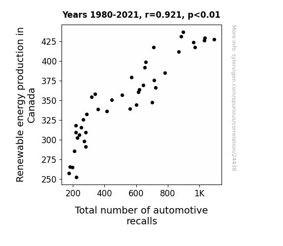 This means 84.9% of the change in the one variable (i.e., Total number of automotive recalls) is predictable based on the change in the other (i.e., Renewable energy production in Canada) over the 42 years from 1980 through 2021.