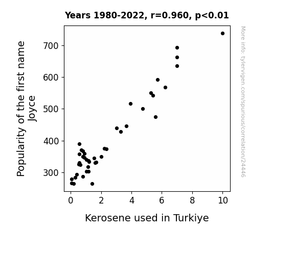 This means 92.2% of the change in the one variable (i.e., Kerosene used in Turkiye) is predictable based on the change in the other (i.e., Popularity of the first name Joyce) over the 43 years from 1980 through 2022.