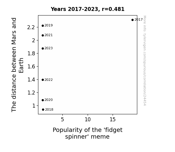 This means 23.1% of the change in the one variable (i.e., Popularity of the 'fidget spinner' meme) is predictable based on the change in the other (i.e., The distance between Mars and Earth) over the 7 years from 2017 through 2023.
