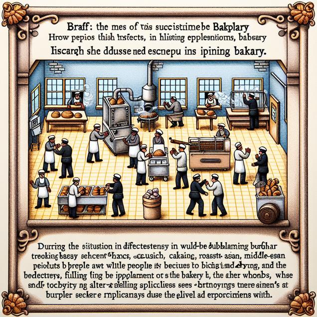 User prompt: Please respond with an image generation prompt that would be likely to create an interesting visual using DALLE-3, using the following style: [ a funny image you would see on reddit ] and depicting this scene: In Arkansas, as the number of food and tobacco roasting, baking, and drying machine operators and tenders increases, the employment opportunities for aspiring burglars decrease. Picture a bakery bustling with workers operating the machines, and as a result, there are fewer individuals turning to a life of crime. However, during times of low demand for these specialized workers, we see a surge in would-be burglars seeking alternative employment, leading to a rise in burglary rates. Keep the visual depiction simple. Do not include any words or speech bubbles.
