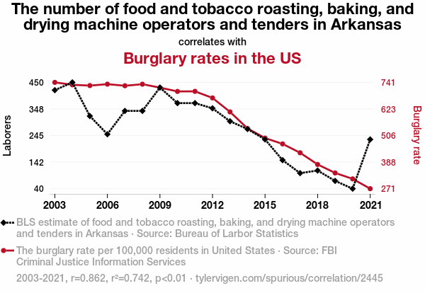 This means 74.2% of the change in the one variable (i.e., Burglary rates in the US) is predictable based on the change in the other (i.e., The number of food and tobacco roasting, baking, and drying machine operators and tenders in Arkansas) over the 19 years from 2003 through 2021.