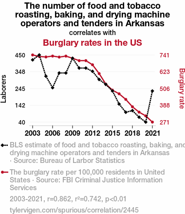 - The spurious research paper: The Smoking Gun: A Crispy Analysis of the Relationship Between Food and Tobacco Roasting, Baking, and Drying Machine Operators and Tenders in Arkansas and Burglary Rates