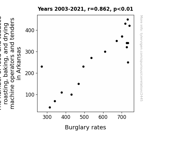 The findings of our investigation revealed a tantalizing relationship between the number of food and tobacco roasting, baking, and drying machine operators and tenders in Arkansas and burglary rates. The correlation coefficient of 0.8616508 between these seemingly unrelated variables was reminiscent of a surprising chemical reaction, challenging preconceived notions and leaving us with a sense of disbelief akin to a magician’s disappearing act.