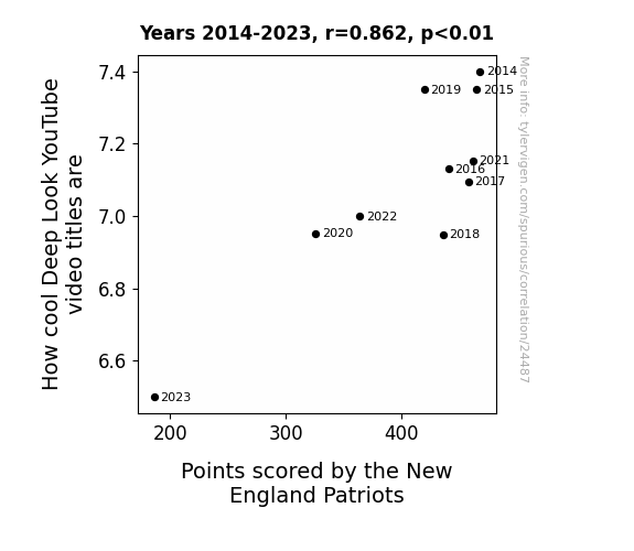 This means 74.3% of the change in the one variable (i.e., Points scored by the New England Patriots) is predictable based on the change in the other (i.e., How cool Deep Look YouTube video titles are) over the 10 years from 2014 through 2023.