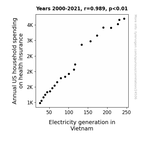 This means 97.9% of the change in the one variable (i.e., Electricity generation in Vietnam) is predictable based on the change in the other (i.e., Annual US household spending on health insurance) over the 22 years from 2000 through 2021.