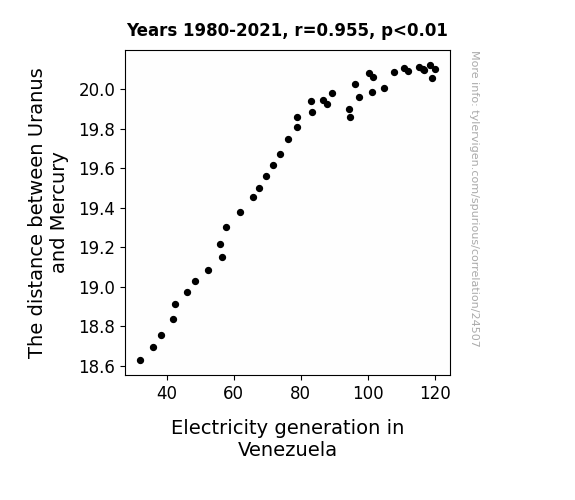 This means 91.3% of the change in the one variable (i.e., Electricity generation in Venezuela) is predictable based on the change in the other (i.e., The distance between Uranus and Mercury) over the 42 years from 1980 through 2021.