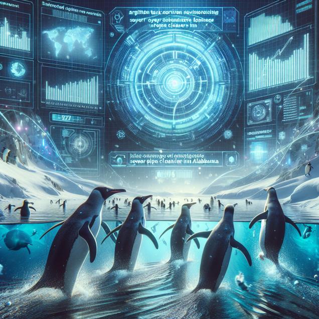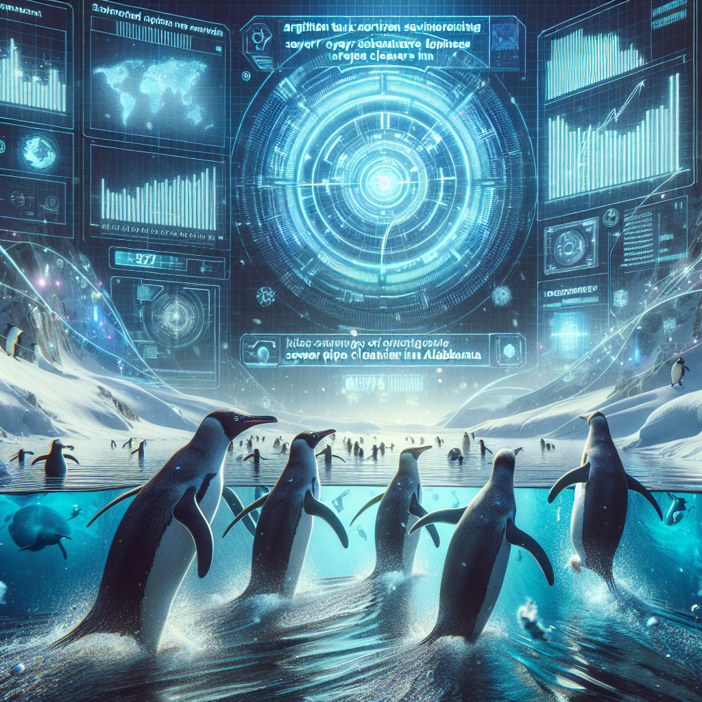 ChatGPT: Generate an image of a futuristic cyberpunk control room with a pulsating holographic chart displaying the fluctuating numbers of septic tank servicers and sewer pipe cleaners in Alabama. In the foreground, showcase a squadron of sleek, augmented reality-enabled penguins swimming through the glacial waters of Antarctica with a sense of purpose. As they navigate, depict their streamlined movements becoming increasingly efficient, hinting at their adaptability and intelligence. Suddenly, as the penguins flap their wings in synchronization, visualize a surge of kinetic energy crackling through the scene, culminating in the unexpected activation of an advanced electricity generation system within the Antarctic landscape. The scene should convey the surprising and almost electric connection between the penguins' graceful movements and the technological marvel unfolding in the cyberpunk environment.