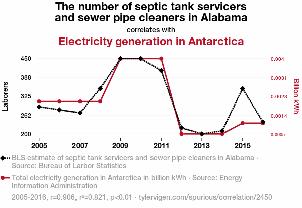 This means 82.1% of the change in the one variable (i.e., Electricity generation in Antarctica) is predictable based on the change in the other (i.e., The number of septic tank servicers and sewer pipe cleaners in Alabama) over the 12 years from 2005 through 2016.