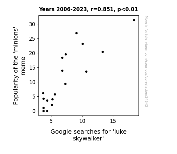 This means 72.4% of the change in the one variable (i.e., Google searches for 'luke skywalker') is predictable based on the change in the other (i.e., Popularity of the 'minions' meme) over the 18 years from 2006 through 2023.