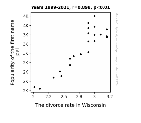 This means 80.7% of the change in the one variable (i.e., The divorce rate in Wisconsin) is predictable based on the change in the other (i.e., Popularity of the first name Joel) over the 23 years from 1999 through 2021.