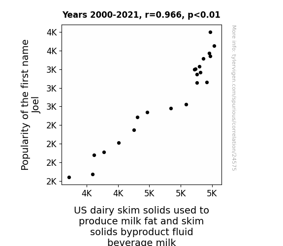 This means 93.3% of the change in the one variable (i.e., US dairy skim solids used to produce milk fat and skim solids byproduct fluid beverage milk) is predictable based on the change in the other (i.e., Popularity of the first name Joel) over the 22 years from 2000 through 2021.